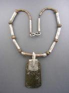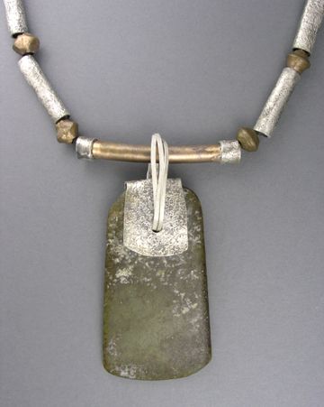 ), ancient Chinese jade, coper beads, rubber cord, 18" long.