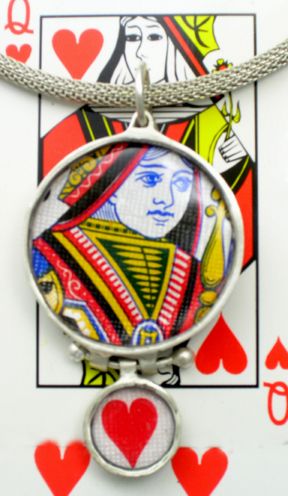 ), cards, resin, 18" oxidized brass chain (silver color).