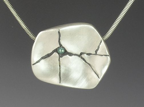 Fine silver (metal clay), natural sapphire. Hollow form, 1½" x 1" x ¼". Sterling chain, 18" long.