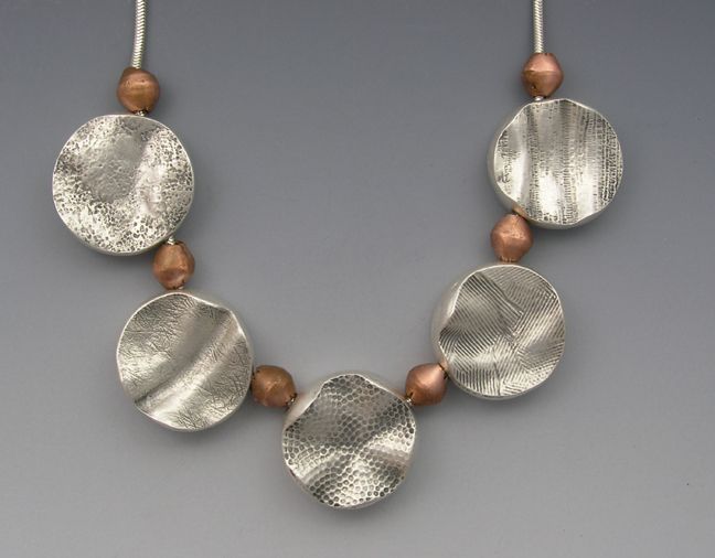 ) , hollow forms, copper beads, sterling snake chain, 16" long.