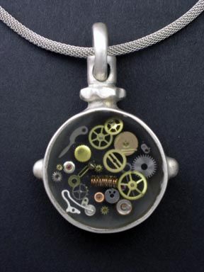 ), watch parts, resin, 18" oxidized brass chain (silver color).
