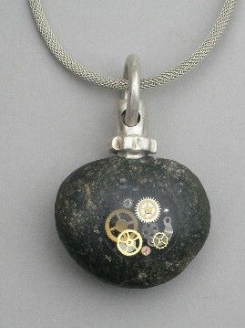 ), rock, watch parts, resin, 18" oxidized brass chain (silver color).
