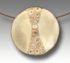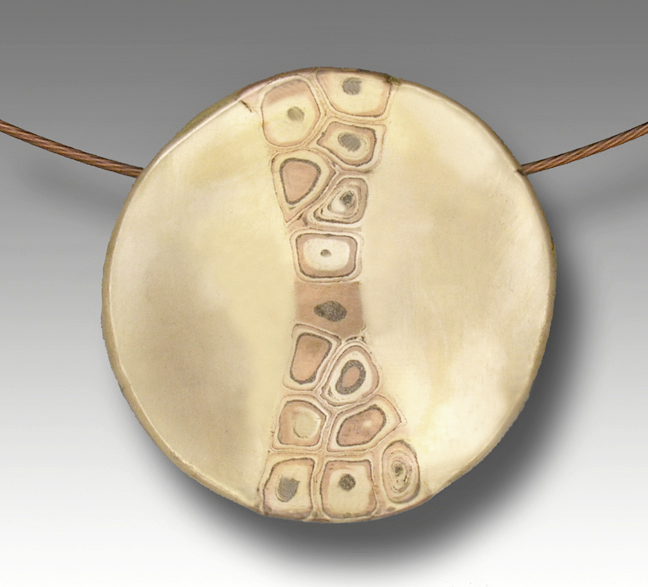 Mokume-gane with bronze, copper and steel. Concave circle, 1˝" x 1˝". Nylon coated steel cable, 18" long. Barrel clasp.