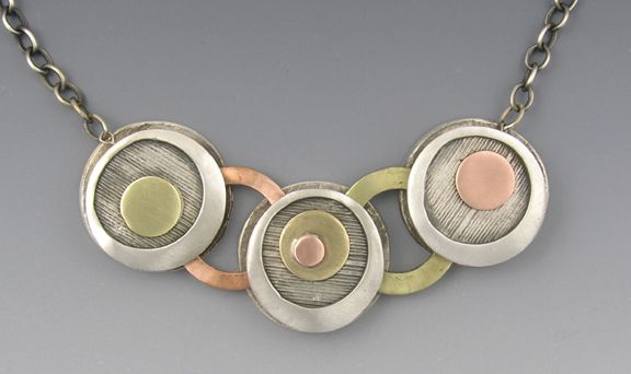 Fine silver (metal clay), copper, brasss, bronze, sterling chain, 16" long. Each circle ¾" in diameter.