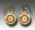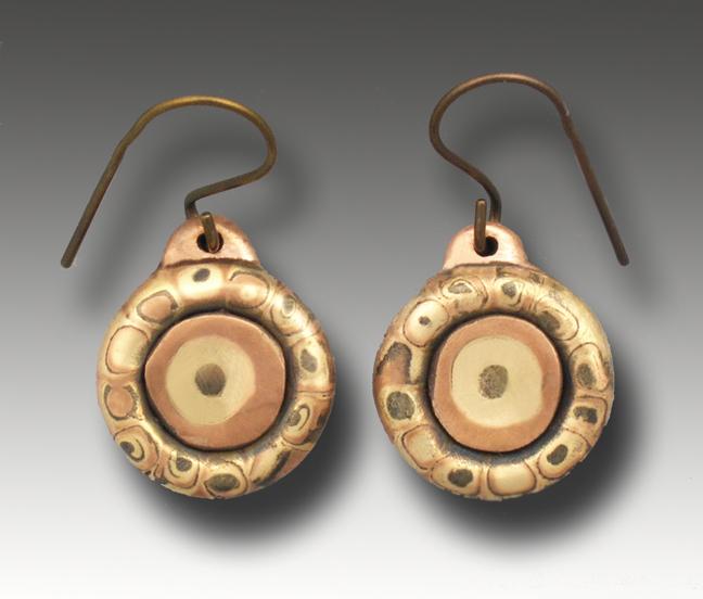 Mokume-gane with bronze, copper and steel. ˝" diameter. Hypo-allergenic niobium ear wires.