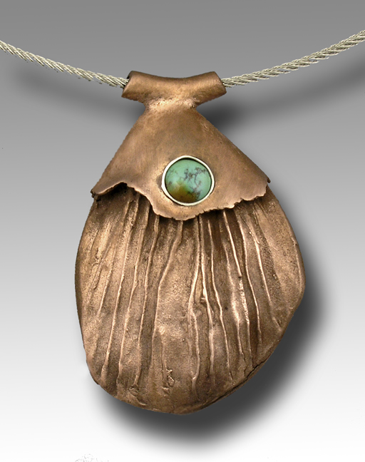 Copper and Turquoise. Hollow form, 1½ z 1" x ¼". Stainless steel cable, 18" long. Spring clasp.