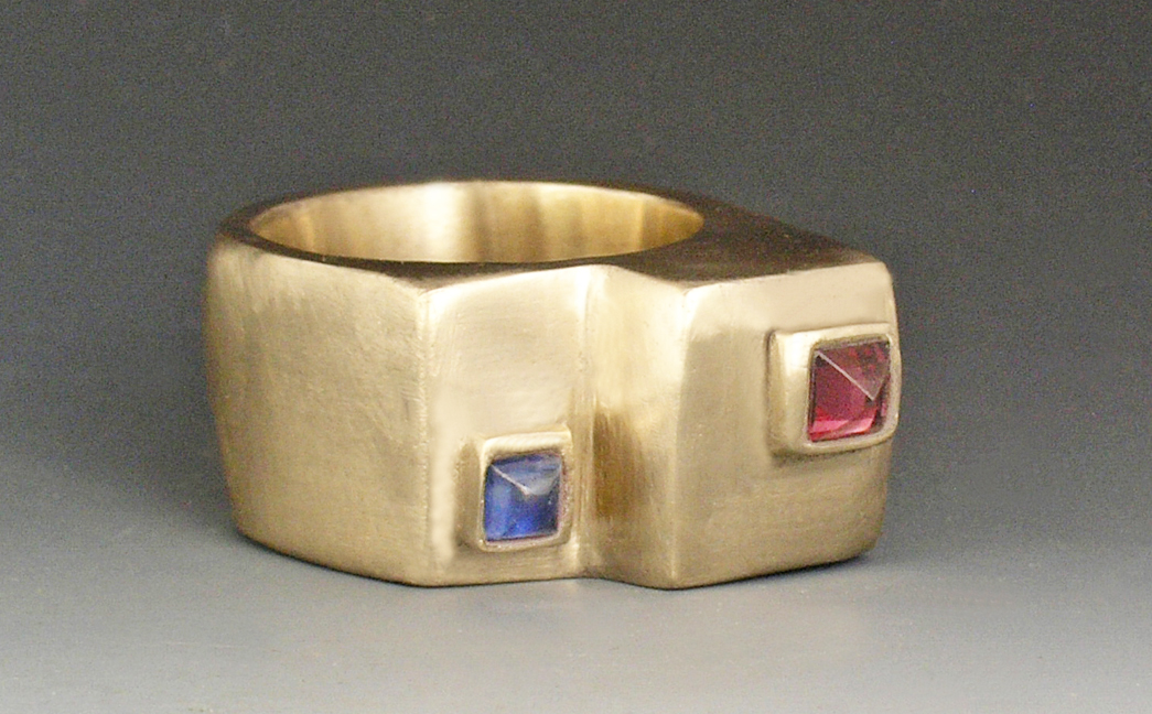 Hollow bronze ring with natural blue sapphire and garnet. Size 7.5. Sorry, no custom orders.