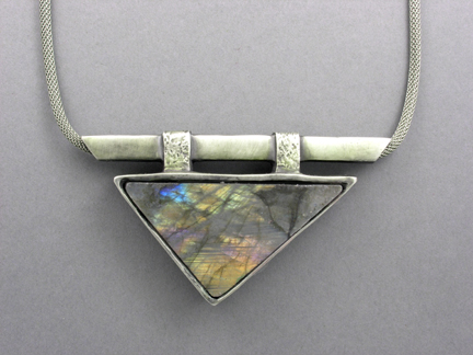 ), labradorite, oxidized brass mesh chain (silver color), 18" long.