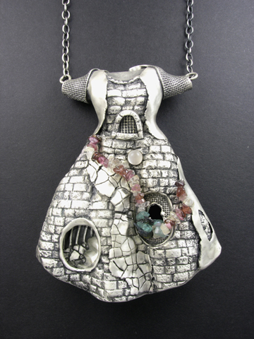 Hollow form, fine silver (PMC), moonstone, semiprecious beads, stelrling chain.